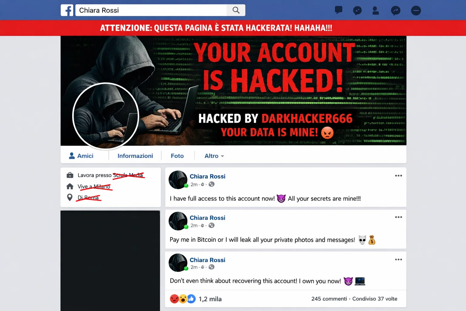 L’utente segnala che l’account è stato hackerato.